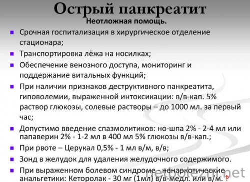 Такие средства должны присутствовать в домашней аптечке у каждого больного панкреатитом, в том числе в хронической форме. Это позволит избежать необходимости вызова скорой помощи за счет быстрого купирования боли лекарствами, находящимися под рукой.• наложение холодного компресса на область с болью (это может быть грелка, содержимое которой — колотый лед, любой продукт из морозильника, завернутый в ткань для исключения обморожения кожного покрова);