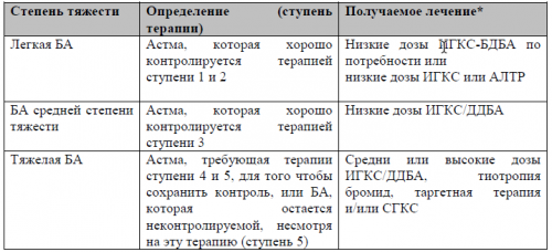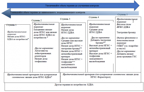 Комментарии: У детей всех возрастов, которые получают специализированную медицинскую помощь, можно назначить более высокие дозы ИГКС (> 800 мкг/сутки) прежде чем перейти к ступени 5.Рекомендации