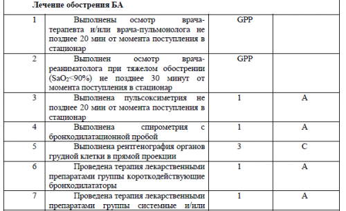 • Ингаляционный ипратропия бромид в комбинации с ингаляционным β-агонистом рекомендуются у детей младше 2-х лет с обострением средней и тяжелой степени тяжести и при неудовлектворительном ответе на начальное лечение КДБА .Методы нетрадиционной и альтернативной медицины• Медицинская реабилитацияТаблицы доказательств заполнялись членами рабочей группы.• У всех пациентов с БА рекомендуется включать в программу реабилитации обучение пациентов и методы физической реабилитации .Лечение обострений БА у детей в возрасте младше 2 лет