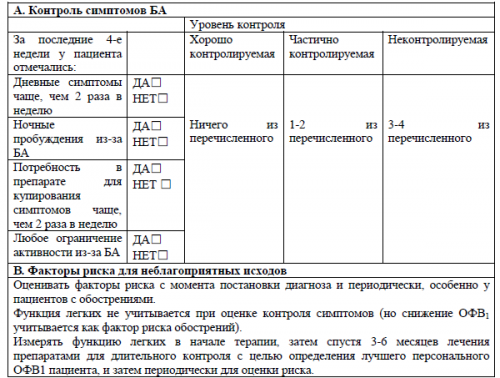 Оценку можно проводить после нескольких месяцев терапии, направленной на контроль заболевания, и, по возможности, после попытки снизить интенсивность терапии для определения ее минимального уровня, эффективного у данного пациента. Поскольку течение БА крайне вариабельно, степень тяжести заболевания может меняться на протяжении месяцев и лет.