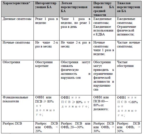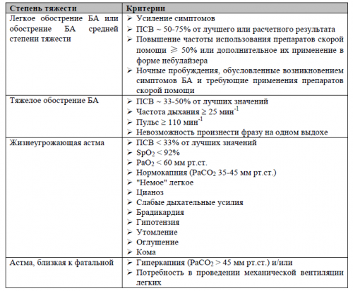 Больные с любой степенью тяжести БА могут иметь легкие, среднетяжелые или тяжелые обострения. У ряда больных с интермиттирующей БА наблюдаются тяжелые и угрожающие жизни обострения на фоне длительных бессимптомных периодов с нормальной легочной функцией.