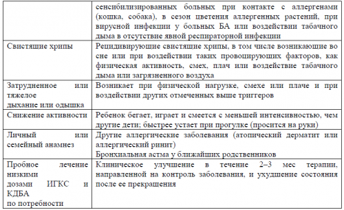 • Пациенткам с БА рекомендуется грудное вскармливание .Проведение ИВЛ требуется больным с обострением БА в тех случаях, когда все другие виды консервативной терапии оказались неэффективными.• Взрослым и подросткам с БА, имеющим ≥ 1 обострения за предшествующий год, для снижения частоты обострений рекомендуется назначение комбинации низких доз ИГКС (будесонид или беклометазон)/формотерол в качестве поддерживающей терапии и для купирования симптомов .Приложение Г7. Характеристики, позволяющие заподозрить БА у детей в возрасте 5 лет и младшеНВЛ – неинвазивная вентиляция легкихТерапия БА у кормящих грудью женщин
