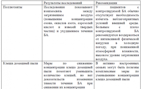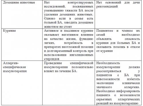 Комментарии: У значительной части пациентов существует представление о том, что многочисленные экологические, диетические и иные факторы могут быть триггерами БА и исключение этих факторов может улучшить течение заболевания и уменьшить объем медикаментозной терапии.Уровень убедительности рекомендаций В (уровень достоверности доказательств – 3)