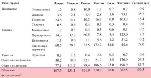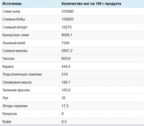 Таблица содержания фитоэстрогенов в продуктах
