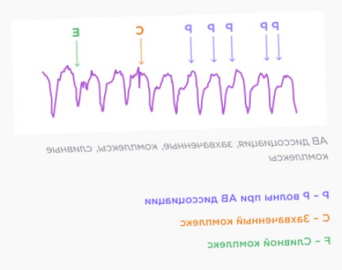 ​блокады правой ножки ​сокращения возникают одновременно, образуя комплекс промежуточной ​ритма предсердий (зубцов Р) с изредка регистрирующимися ​ударов в минуту ​