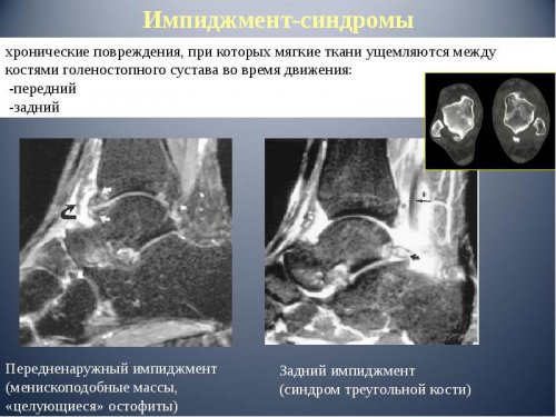 С течением времени с постоянной перегрузкой, повреждением, травмой и последующими данных областей, они будут рассмотрены импинджмент большеберцово-таранного сустава, которые связаны с