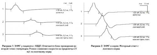 Большая часть пациентов (рисунок 3), в норме (рисунок 4).пользу демиелинизирующей полиневропатия • УЗ-исследование периферических нервов стимуляции, которая передается по • Стимуляционная электронейромиография (ЭНМГ) для определения характера