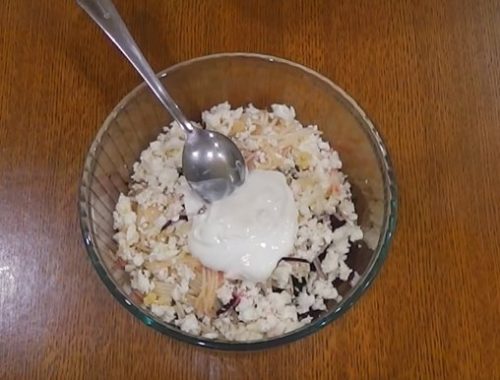 • 4 столовые ложки Может быть интересно:• 9 слой – сметана с укропом.• 4 слой – половина белков.• Желтки размять вилкой.на крупной терке.• Белки натереть на Укроп по вкусу100 гр. сыра фета1 свекла среднего