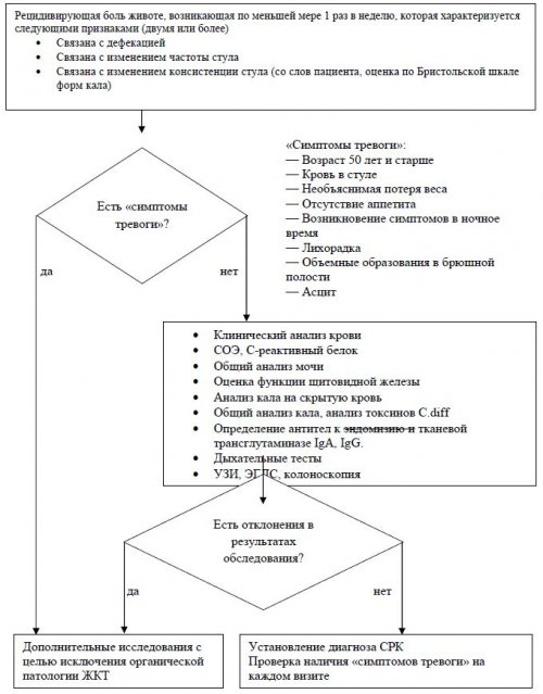 Для лечения СРК с диареей применяются такие препараты, как лоперамида гидрохлорид, диоктаэдрический смектит, невсасывающийся антибиотик рифаксимин и пробиотики.Препараты для купирования боли2. Не пропускать приемы пищи и не допускать длительных перерывов между приемами пищи.Консервативное лечение• Эндометриоз, сопровождающийся циклической болью в нижних отделах живота, увеличением яичников или наличием ретроцервикальных узлов;• Рак толстой кишки;• Воспалительные заболевания кишечника (болезнь Крона и язвенный колит), при которых возможно наличие ректального кровотечения, длительной постоянной диареи, инфильтрата в брюшной полости, необъяснимой потери массы тела, анемии, а также перианальные поражения (свищи, трещины). При подозрении на указанные патологии больной должен быть направлен на илеоколоноскопию;Дифференциальный диагноз СРК проводится со следующими патологиями [19,20]:• Выполнение водородного дыхательного теста с глюкозой или лактулозой для выявления синдрома избыточного бактериального роста у пациентов с диарейным и смешанным вариантом заболевания;Однако, такой подход чреват серьезными диагностическими ошибками, поскольку целый ряд органических заболеваний, таких как хронические воспалительные заболевания кишечника, микроскопические колиты и даже опухоли толстой кишки, могут протекать с клинической картиной СРК при отсутствии «симптомов тревоги» (см. пункт Дифференциальная диагностика). Поэтому целесообразно рассматривать СРК как диагноз исключения. Для его постановки необходимо выполнение следующих исследований:22,0-26,0