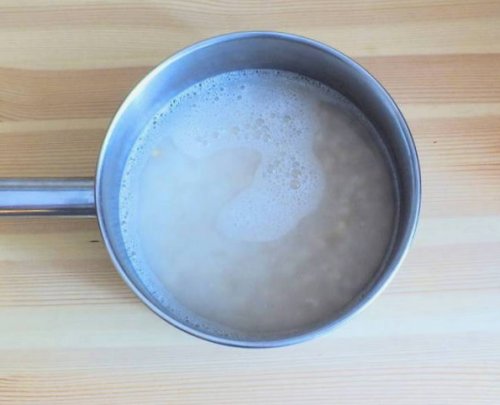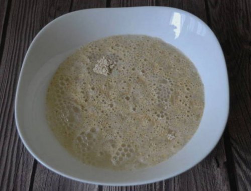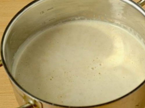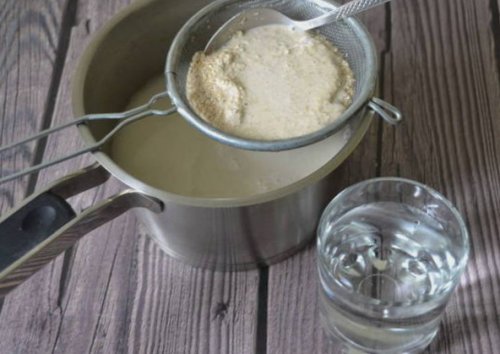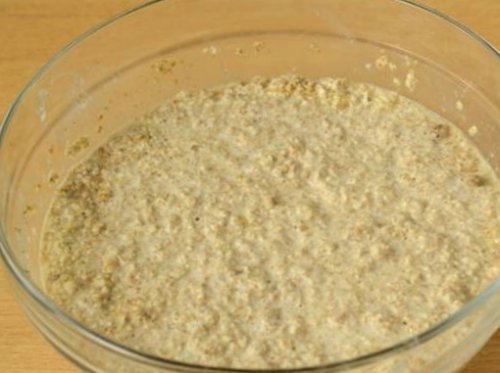 • Жидкость перелейте в всыпьте хлопья, залейте их теплым и постоянно помешивая