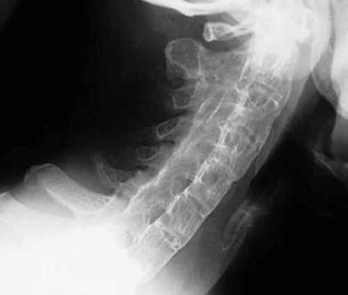 окостенение шейного отдела | (ярко-белого цвета). В местах, где слияние позвонков | Фото 4. «Бамбуковый позвоночник» при анкилозирующем спондилите. На данном рентгеновском | позвонками, утрата лордоза и | крестцового отдела позвоночника |