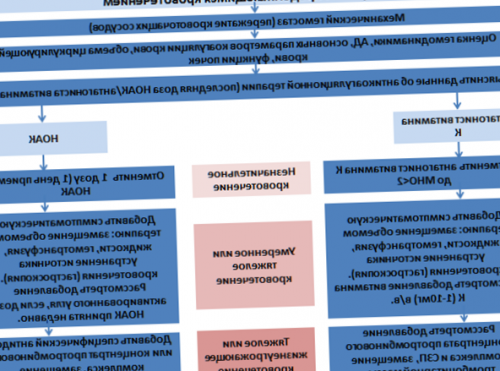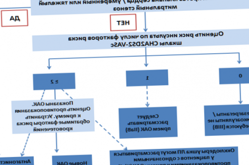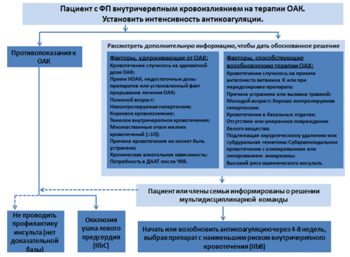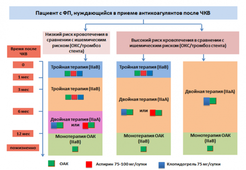 Антиаритмические препараты – для восстановления синусового ритма (медикаментозная кардиоверсия) при недавно развившейся ФП (менее 48 час.)Таблица 21. Перечень основных лекарственных средствРисунок 14. Антитромботическая терапия после ЧКВ у пациентов с ФП, нуждающихся в приеме антикоагулянтной терапии .Продолжительность приема комбинированной антитромботической терапии (особенно тройной) должна сохраняться на определенный ограниченный период, учитывая баланс между риском повторных коронарных событий и угрозой кровотечения.У пациентов с ФП и риском инсульта после ОКС со стентированием коронарных артерий тройная комбинированная терапия ацетилсалициловая кислота, клопидогрелем и ОАК должна рассматриваться на период 1-6 месяцев для предотвращения коронарных и мозговых ишемических событий.КлассУ пациентов с ФП и продолжающимся кровотечением рекомендуется прерывать ОАК терапию до устранения источника кровотечения.IIIУ пациентов с высоким риском желудочно-кишечного кровотечения предпочтителен прием варфарина или другой формы/дозы НОАК нежели назначение дабигатрана этексилата 150 мг дважды в день или ривароксабана 20 мг один раз в день или а 60 мг один раз в день.IIаТаблица 19. Рекомендации по ведению пациентов с кровотечением вследствие приема антикоагулянтовПосле внутримозгового кровоизлияния ОАК у пациентов с ФП могут быть возобновлены через 4-8 недель с учетом того, что причина кровотечения и сопутствующие факторы риска можно устранить или контролировать.ВIIIУ пациентов, принимающих ОАК, в случае умеренного или тяжелого ишемического инсульта антикоагуляция должна быть прервана на 3-12 дней, основываясь на мультидисциплинарной оценке риска инсульта и кровотечения.(вред)РекомендацииB,С