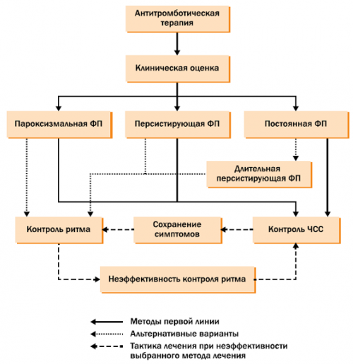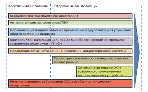 При продолжительности пароксизма ФП/ТП менее 48 часов, рассматривается незамедлительное проведение кардиоверсии: электрической при гемодинамической нестабильности пациента (низкое АД, симптомы шока, острой СН) или медикаментозной при удовлетворительной переносимости пациентом состояния. При этом актуальны рекомендации по проведению экстренной электрической кардиоверсии, указанные в Приложении 1 по неотложной помощи на догоспитальном этапе.Ответы на эти вопросы будут зависеть от формы ФП, длительности эпизода ФП, субъективной переносимости симптомов ФП пациентом, суммарной оценки риска ТЭО и риска кровотечений у конкретного пациента, а также от принятия во внимание коморбидной патологии и индивидуальных особенностей больного.· Восстанавливать синусовый ритм или контролировать ЧСС при ФП?· улучшение показателей качества жизни пациентов.· отсутствие сердечной декомпенсации, обусловленной тахикардиеиндуцированной кардиомиопатией;