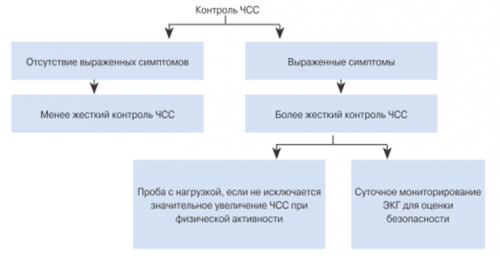 Первоначальной целью стратегии контроля частоты следует рассматривать достижение ЧСС<110 в мин в покое.