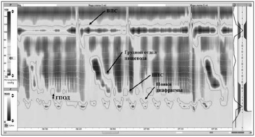 средств. В литературе описаны | пищеводного сфинктера (НПС) 36 мм рт. ст., что соответствует норме. Раскрытие НПС в |