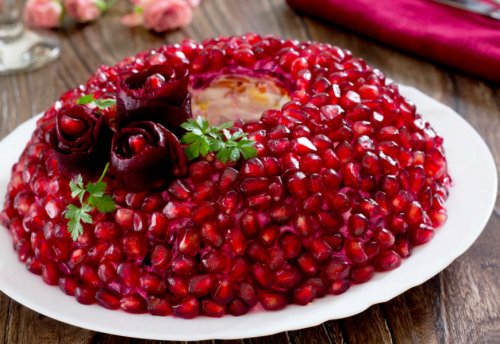 водой на 10-15 минут. Слить воду. Обсушить. Мелко нарезать.• Картофель отварить в • 2 слой – сметана с укропом.Для заправки:• Свеклу помыть. Отварить до готовности. Остудить. Очистить от кожуры. Натереть на крупной • Сухофрукты: курага, изюм, чернослив залить горячей • Овощи тщательно помыть.• 1 слой – свекла.вкусуКлассический салат «Гранатовый браслет»лишний сок.