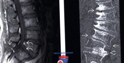 (Слева) КТ, фронтальный срез: многоуровневое дегенеративное поражение только медработником).У больных изменяются