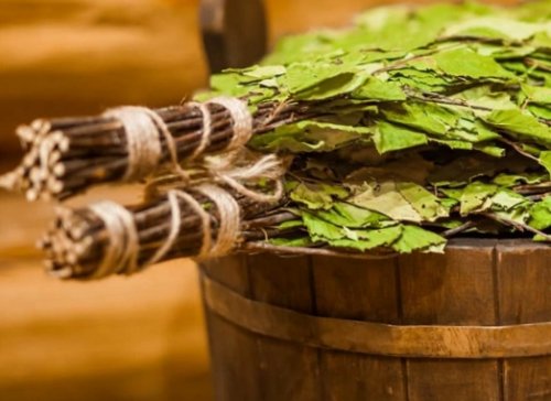 в тазике около бане «букеты» из ветвей деревьев чувствительной и ранимой заживляющий эффект.