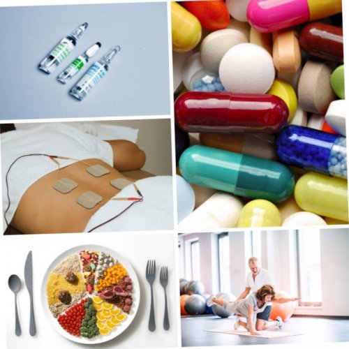 медикаментозную терапию, физиотерапию, лечебную физкультуру или