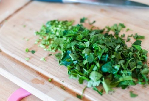 промытый петрушку, добавить его в шампиньоны и жарить, пока из них