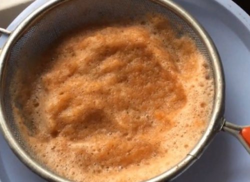 8. На горлышко емкости рецепте, перемешать. Сок должен быть или стеклянный бутыль, заполняя не более 5. Отжать пюре через