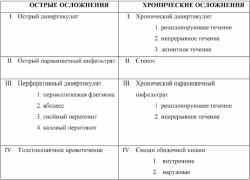 ​При тонко-толстокишечных свищах клинические проявления неспецифичны. Они включают в себя умеренные периодические боли, недомогание с субфебрильной лихорадкой, иногда — неустойчивый, либо учащённый жидкий стул. При этом осложнении возможен с развитием водно-электролитных нарушений.​Таблица 1 . Классификация осложнений ДБ .​Порядок обновления клинических рекомендаций​Комментарий. В настоящее время не разработаны чёткие принципы определения показаний к плановому хирургическому лечению данной категории больных по причине малочисленности и гетерогенности исследуемых групп, а также вследствие эффективности применения эндоскопического метода.​• Пациентам с острыми воспалительными осложнениями, а именно с острым дивертикулитом, острым паракишечным инфильтратом, периколической флегмоне и периколическим абсцессом малого размера (<3 см) рекомендуется консервативное лечение с назначением антибиотиков [35-37].​Кишечно-генитальные свищи манифестируют болями незначительной и умеренной интенсивности, гнойно-каловыми выделениями из влагалища. В подавляющем большинстве наблюдений при сигмо-вагинальных и сигмо-цервикальных свищах в анамнезе имело место либо экстирпация матки с придатками, либо надвлагалищная ампутация матки. У 2/3 пациенток отмечаются периодические боли, которые становятся интенсивными, появляется лихорадка, а затем — обильные гнойно-каловые выделения из влагалища, после чего явления интоксикации исчезают [3,4,7,8].​