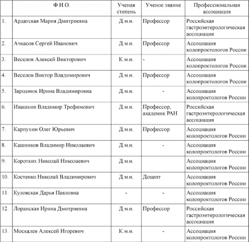 ​• Профилактика​Конфликт интересов отсутствует.​Наличие свища ободочной кишки как осложнения дивертикулярной болезни является показанием к плановому хирургическому лечению. Свищи ободочной кишки при дивертикулярной болезни не имеют тенденции к спонтанному закрытию, так как внутреннее отверстие свища представляет собой устье дивертикула с сохранённой слизистой . Консервативные мероприятия при свищах следует рассматривать как подготовку к хирургическому вмешательству. Они позволяют достичь лишь кратковременного снижения интенсивности и распространённости воспаления вокруг свищевого хода и проводятся с целью создания оптимальных условий для выполнения хирургического вмешательства, а не в качестве самостоятельного метода лечения [27,41].​Исследование двигательной активности толстой кишки при ДБ не имеет практического значения. Возможности МРТ брюшной полости в настоящее время изучены недостаточно.​Клиническая картина при осложнённой форме ДБ крайне полиморфна.​• Госпитализация​Приложение А1. Состав рабочей группы по разработке и пересмотру клинических рекомендаций​Остальные факторы должны рассматриваться в качестве дополнительных: возраст до 50 лет, число рецидивных атак, длительный системный приём нестероидных противовоспалительных препаратов, иммунносупрессивная терапия, биологическая терапия, коллагеновые и сосудистые заболевания, выраженность сопутствующих заболеваний [48,49].​