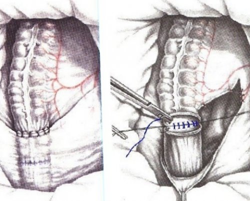 ​4. Формирование анастомоза желательно между отделами с неутолщённой эластичной стенкой, не содержащей дивертикулы в непосредственной близости к линии кишечного шва.​