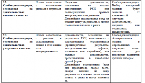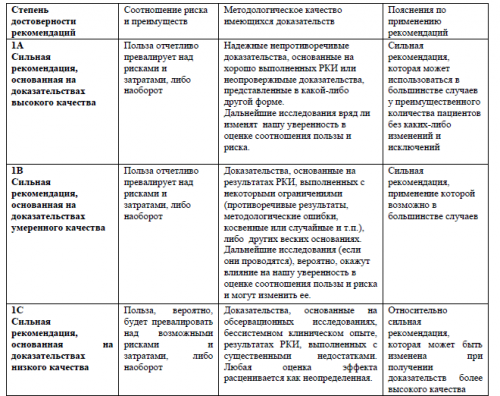 Сила рекомендаций (1-2) на основании соответствующих уровней доказательств (А-С) и индикаторы доброкачественной практики (табл. 1) – good practice points Консультация и экспертная оценкаВнешняя экспертная оценка.– GPPs)При отборе публикаций, как потенциальных источников доказательств, использованная в каждом исследовании методология изучается для того, чтобы убедиться в ее валидности. Результат изучения влияет на уровень доказательств, присваиваемый публикации, что в свою очередь, влияет на силу рекомендацийоценка значимости в соответствии с рейтинговой схемой.