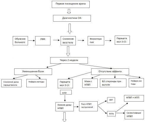 НПВП применяют в случае неэффективности парацетамола, а также при наличии признаков воспаления (А). При сильной боли в суставах лечение следует начинать сразу с НПВП (А). НПВП применяются в минимальной эффективной дозе назначаются на максимально короткие сроки (А).Осложнения со стороны ЖКТ — одни из наиболее серьёзных побочных эффектов НПВП. Относительный риск их возникновения варьирует у различных НПВП и дозозависим.Парацетамол показан при слабых или умеренных болях при ОА без признаков воспаления. В дозе 3,0 г/сут. доказана безопасность применения парацетамола при ОА в течение 2 лет. Высокие дозы сопровождаются развитием осложнений со стороны ЖКТ, почек и вызывают повышение артериального давления у мужчин и женщин. Препарат не следует назначать больным с поражениями печени и хроническим алкоголизмом.