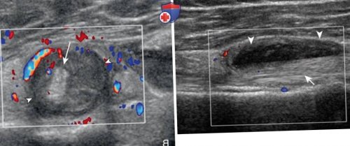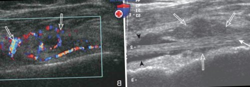 продольном сечении визуализируются синовиальная оболочка (незакрашенные стрелки). Правая сторона изображений