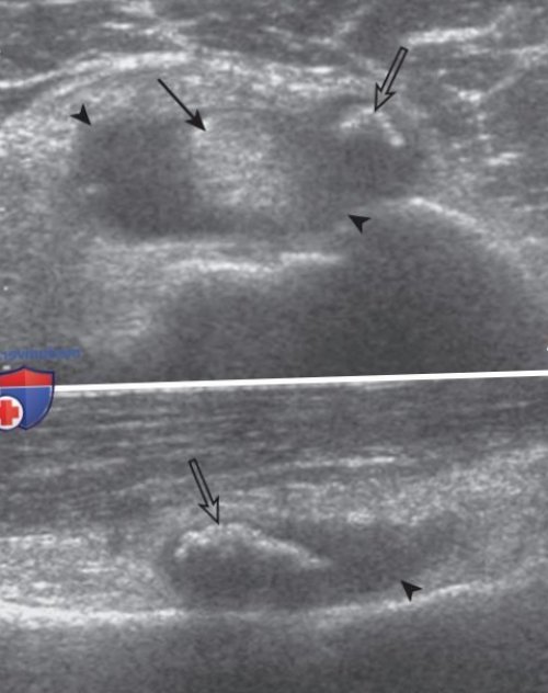 мышцы плеча. На эхограммах сухожилия как неоднородная гипо-, изо- или гиперэхогенная жидкость | |