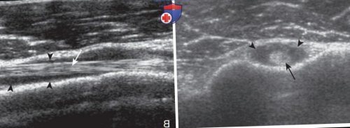 (головки стрелок) в поперечном (А) и продольном (В) сечении визуализируется гиперэхогенное | плеча, необходимо отличать от |