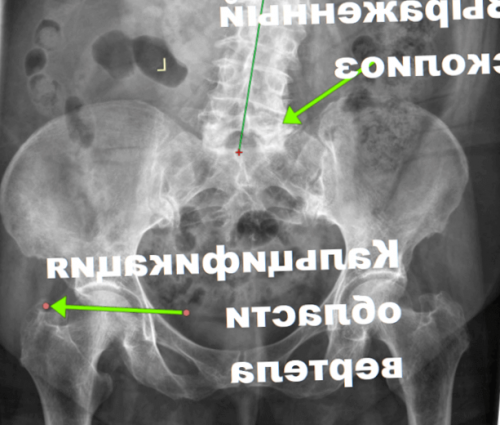 А на рентгене мы видим сколиоз и кальцификацию вследствие длительного воспаления области вертела и сухожилий. Причем тазобедренные суставы в весьма неплохом состоянии.